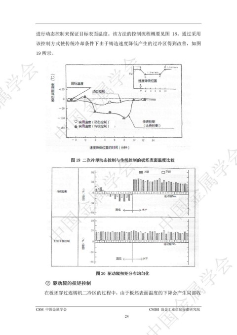 进行动态控制来保证目标表面温度。该方法的控制流程概要见图 18。通过采用 该控制方式使传统冷却条件下由于铸造速度降低产生的过冷区得到改善,如图 ᇏݓࣁඋ࿐߶ 19 所示。 ᇏݓࣁඋ࿐߶ 图 19 二次冷却动态控制与传统控制的板坯表面温度比较 ᇏݓࣁඋ࿐߶ ᇏݓࣁඋ࿐߶ ᇏݓࣁඋ࿐߶ 图 20 驱动辊扭矩分布均匀化 ⑦ 驱动辊的扭矩控制 在板坯穿过连铸机二冷区的过程中,由于板坯表面温度的下降会产生局部收 CSM 中国金属学会 CMISI 冶金工业信息标准研究院 24