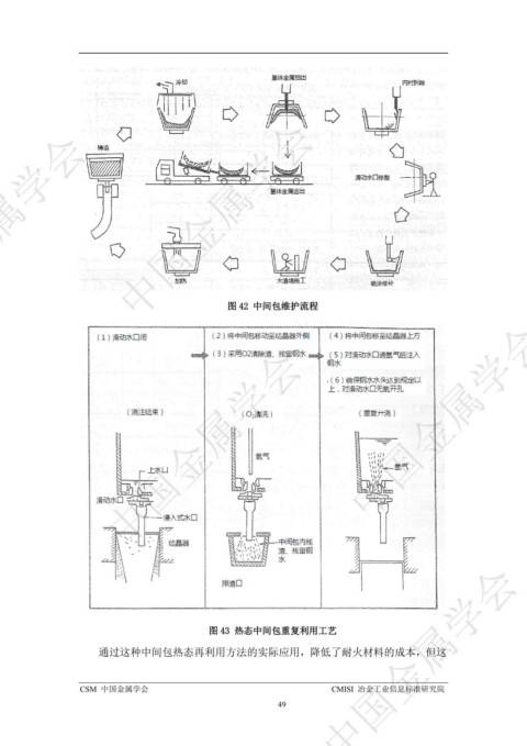 ᇏݓࣁඋ࿐߶ ᇏݓࣁඋ࿐߶ 图 42 中间包维护流程 ᇏݓࣁඋ࿐߶ ᇏݓࣁඋ࿐߶ ᇏݓࣁඋ࿐߶ 图 43 热态中间包重复利用工艺 通过这种中间包热态再利用方法的实际应用,降低了耐火材料的成本,但这 CSM 中国金属学会 CMISI 冶金工业信息标准研究院 49