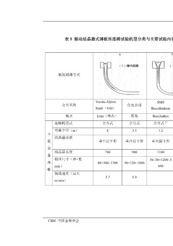 表 5 振动结晶器式薄板坯连铸试验机型分类与主要试验内容(按照纽柯、阿维迪、Avesta-Sheffield 的生产设备分类)