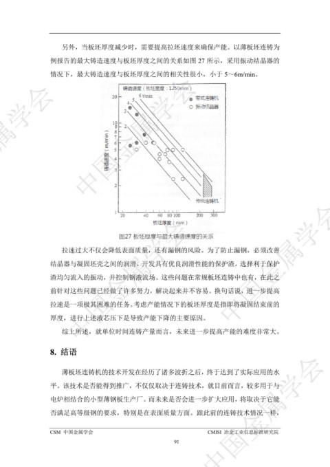例报告的最大铸造速度与板坯厚度之间的关系如图 27 所示,采用振动结晶器的