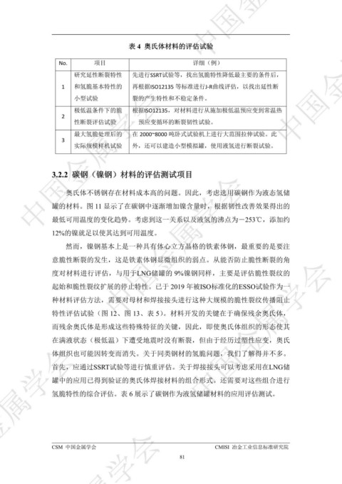 氢脆特性的综合评估。表 6 展示了碳钢作为液氢储罐材料的应用评估测试。
