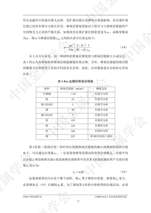 表 1 Fcc 金属的堆垛层错能