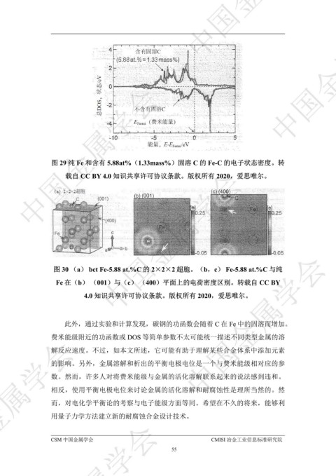 图 29 纯 Fe 和含有 5.88at%(1.33mass%)固溶 C 的 Fe-C 的电子状态密度。转 ᇏݓࣁඋ࿐߶