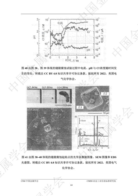 图 40 由图 38、图 39 体现的缝隙腐蚀试验过程中电流、pH 与 Cl 浓度随时间发 ᇏݓࣁඋ࿐߶